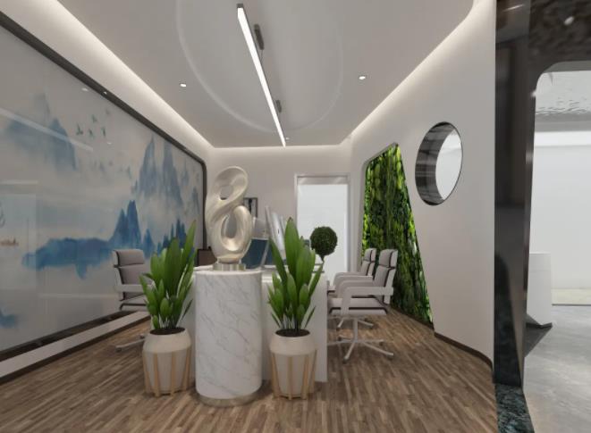 3、天花水波紋鏡面不銹鋼波光粼粼,倒影婆娑,中間點(diǎn)綴白色射燈,星光點(diǎn)點(diǎn),仿佛仰望銀河,體驗(yàn)區(qū)靠落地窗橢圓拱形網(wǎng)狀金屬鏤空材質(zhì),霧里看花,花更美,營造朦朧隱約東方詩意之境,呼應(yīng)品茶洽談區(qū)中式嵌入式茶桌,讓顧客感受尊貴體驗(yàn)同時(shí)一覽江景,身心徹底放松達(dá)到物我兩忘之境。辦公樓產(chǎn)品展示區(qū)蜂窩背發(fā)光造型突出展品的高科技品質(zhì)感。辦公區(qū)裝飾設(shè)計(jì):山水玻璃隔斷與綠植墻共同營造呼吸在山水綠意之間的意境,讓工作充滿詩意與生機(jī),通透圓形玻璃與前廳區(qū)連接,運(yùn)用借景設(shè)計(jì)手法,給空間帶來意趣。